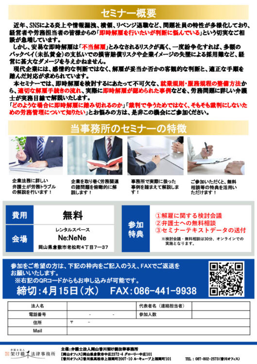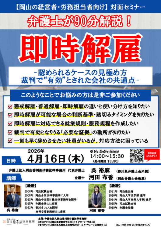 本セミナーでは、即時解雇を検討するにあたって不可欠な、就業規則・服務規程の整備方法から、適切な解雇手続きの流れ、実際に即時解雇が認められた事例などを、労務問題に詳しい弁護士が実務目線で解説いたします。